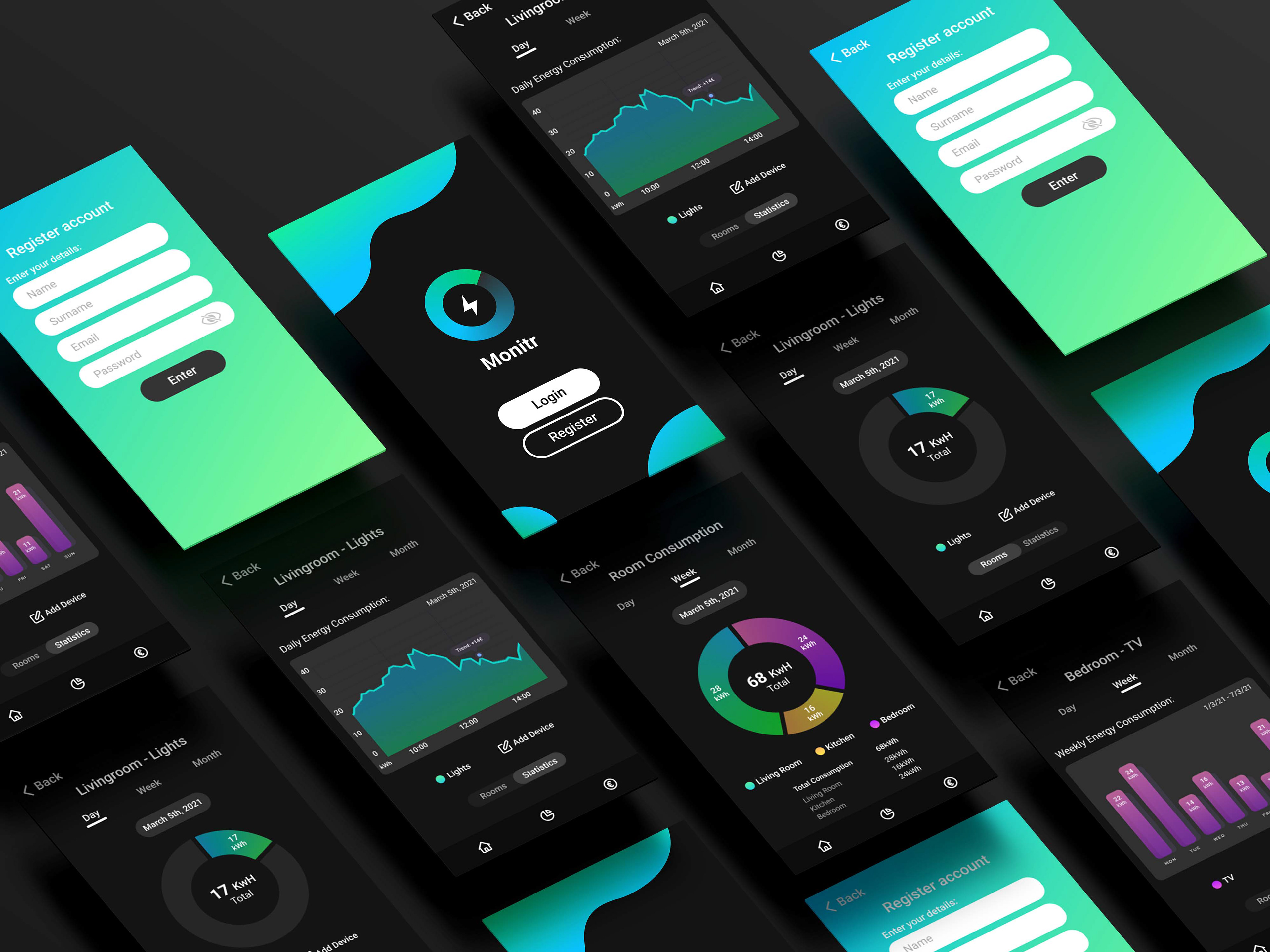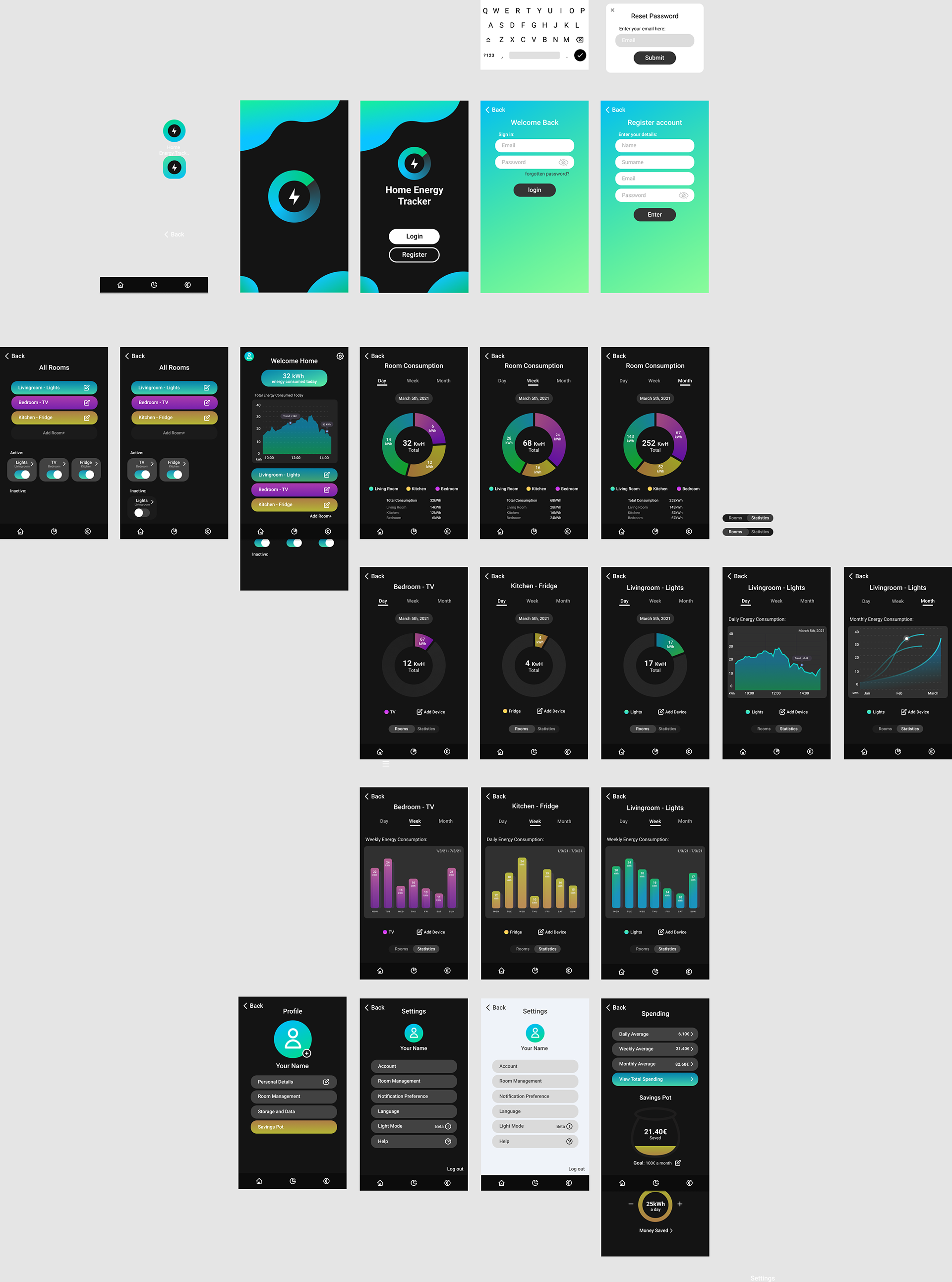 I have created a prototype for an energy monitoring app that detects the amount of energy used within the household, which is categorised by separate rooms. It detects the energy used by various appliances within the specified rooms, and illustrates the usage daily, weekly and monthly with charts.